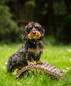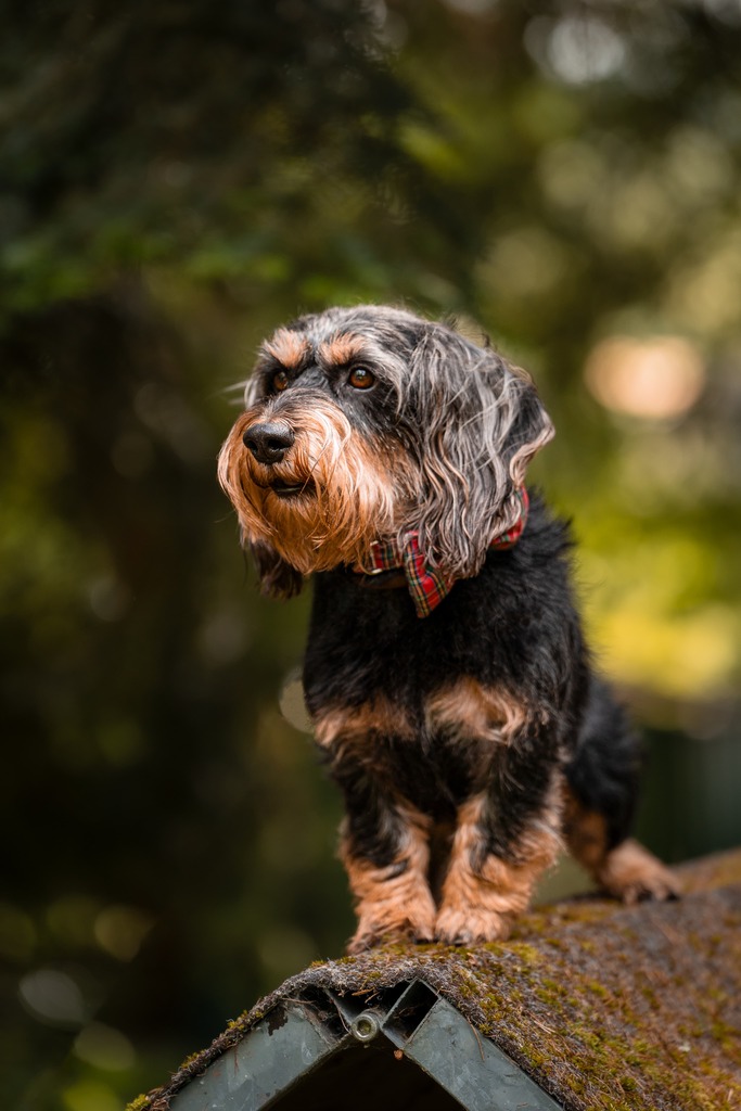 Kommissar Rex vom Schusterstein – ein Dackel mit Eigenwillen ist ein dunkelsaufarbener Zwergrauhaardackel und ein echter Charakterkopf – mit ausgeprägten Augenbrauen, Dackelbart und einem weißen Fleck am linken Ohr.